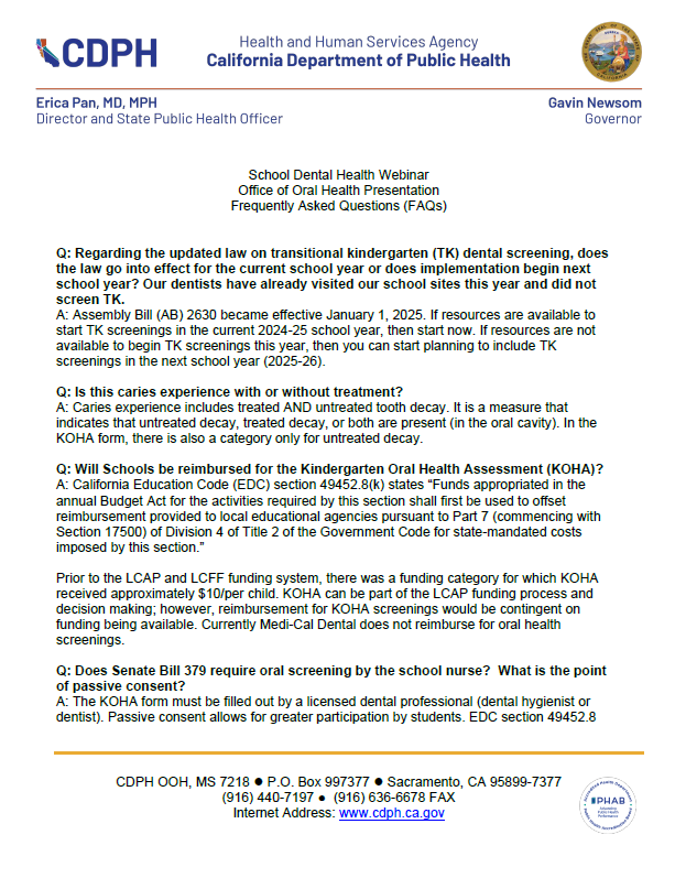 The Kindergarten Oral Health Assessment (KOHA) requirement was passed into law in 2005 by Assembly Bill 1433 (AB 1433) under the Education Code Section 49452.8. In 2025, Assembly Bill 2630 specifies “kindergarten” to include both transitional kindergarten (TK) and kindergarten, requiring children enrolled in public school for their first year in transitional kindergarten (TK), kindergarten, or first grade to have an oral health screening completed by a licensed dental professional.